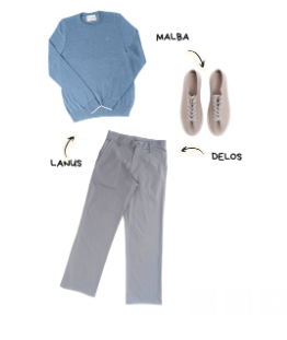 Los DELOS Trousers en gris mantienen el outfit limpio, mientras que los Malba Gris le dan ese toque cool que combina perfecto con la energía fiestera del tema.