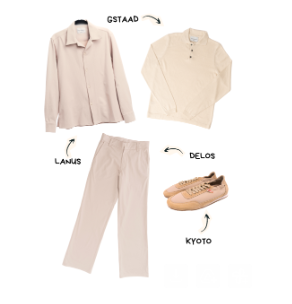 Este look es limpio y pulido. Combina la camisa LANUS con los DELOS Trousers en tono neutro y suma la GSTAAD para un acabado elegante sin esfuerzo.